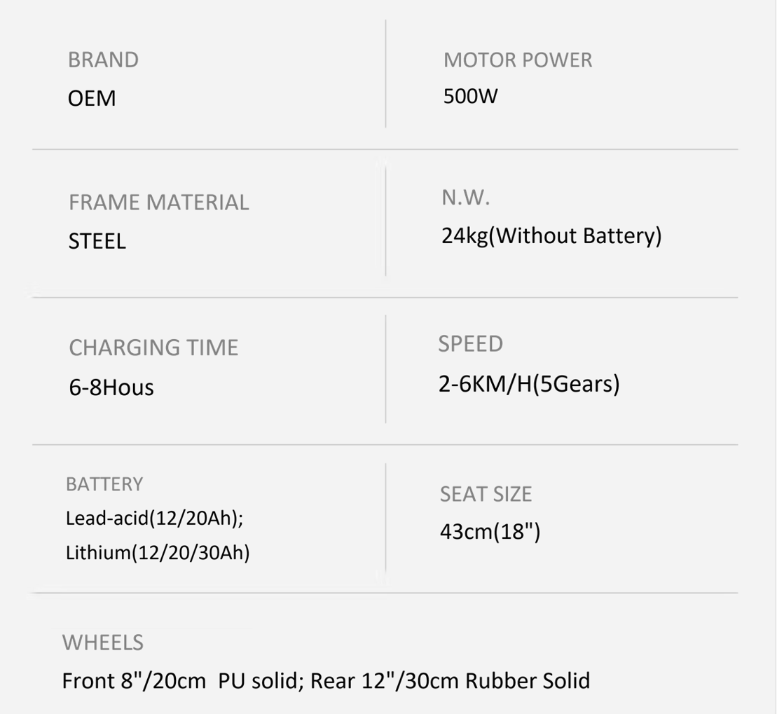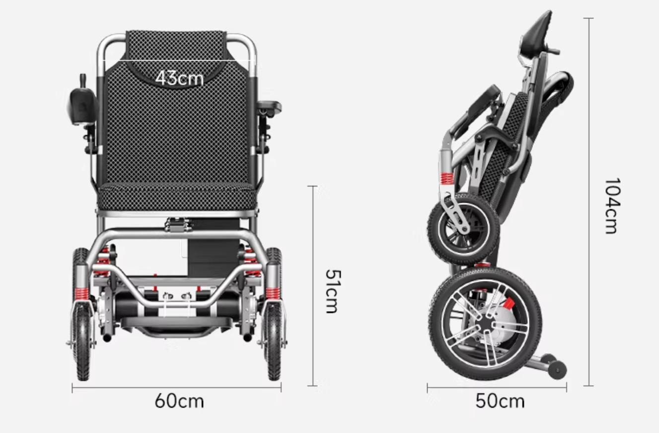 CP-EW215 compact folding electric wheelchair Size Unfolded Size L105*W60*H92cm Folded Size L60*W35*H92cm Seat W43*D45*H53cm Material Framework Steel powder painting, Tube dia*thickness: 25.4*1.6; 32*1.5mm Armrest PU foaming, H22cm Front Casters PU foaming, Dia 8"/20cm Back Casters Pubber solid, aluminum hub; Dia 12"/30cm Power system Battery Lead-acid(12/20Ah) Lithium(12/20/30Ah) Motor 500W(250w*2pcs) Brake electronic/electromagnetic Performance Safety load 130kg Running distance 20km Speed 0-6km/h Slope 8° Weight Net weight 24kg(Without Battery) Gross weight 29kg Package Carton 61*36*94cm (20GP: 137 pcs; 40HQ: 330 pcs)...